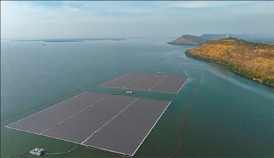 中企在泰国孔敬府承建的乌汶叻水面漂浮光伏电站,运用人工智能技术,有效融合水面光伏、清洁水电、高效储能和智慧管理系统。人民日报记者 白元琪摄